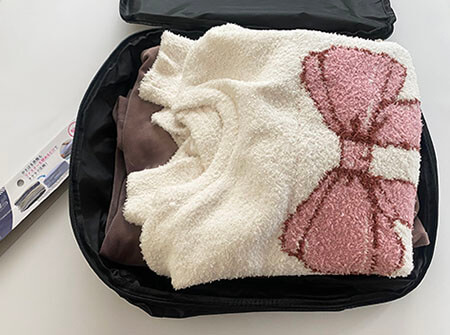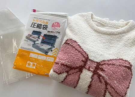 冬用のふわふわのルームウェアは温かく着心地がいいですがボリュームがあるので旅行には不向きな気がしますが圧縮袋に入れて空気をぬけばかなりボリュームを抑えられます