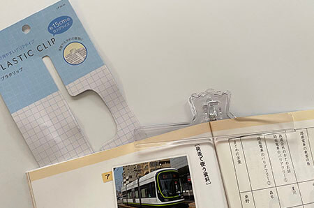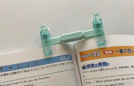 クリップが左右別々なのでページの厚みに左右差があっても外れにくく、クリア素材なので下に文字があっても見やすくなっています
