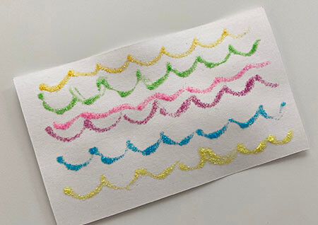 本体をペンのように持ち押すと、ペン先からキラキラとしたラメ入りのカラフルなのりが出てきます、ペンよりも広範囲にかけるのでイラスト、装飾にむいているかなと思います