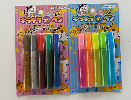 「キラキラのりペン ダークカラー5色」「ライトカラー5色」(110円)