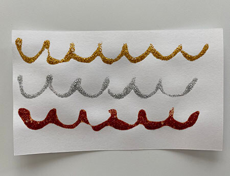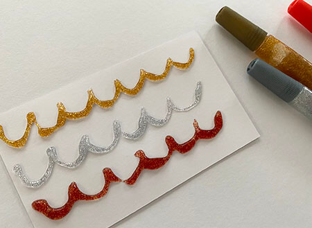 ダークカラーのゴールド、シルバー、レッドを試してみました、押しながらのりを出すのでコツが必要ですが慣れる案外書きやすいと思いました