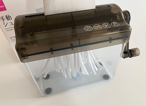 シュレッターは業務用で高価そう&電気を使うのでコンセントの近くにしかおけないというイメージでしたが電気を使わない安価な手動タイプも販売されています